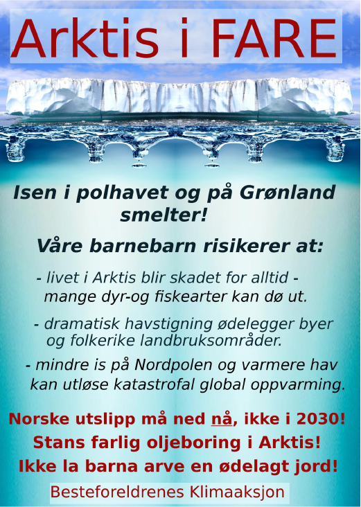 – I Arktis øker temperaturen enda raskere enn i resten av verden. Det betyr en stadig minkende havis og store problemer for livet i polhavet. Det skremmende er at også Grønlandsisen smelter mange ganger så fort som normalt. Vi vet at hvis hele Grønlandsisen smelter, vil havnivået stige sju meter. Nå kommer det stadig flere rapporter som viser at isen ved begge polene smelter mye raskere enn ventet. Enkelte forskere frykter det kan bli opptil to meter havstigning allerede i dette århundret. Risikoen for en så farlig utvikling – som kan ramme våre egne barnebarn – må etter vår mening få umiddelbare konsekvenser for klimapolitikken. Det nytter ikke lenger å skyve problemene foran seg, eller å love 40 prosent kutt i 2030, slik regjeringen gjør. Lite tyder på at de vil klare det. Og selv om de skulle lykkes, er det for lite for seint. Det vi trenger er full satsing på fornybar-teknologi, miljøvennlig infrastruktur og grønn avgiftspolitikk. NÅ!