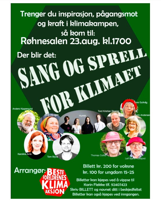Fine greier, og noe flere bør la seg inspirere av. Det å få en positiv vinkling på klimakampen gjennom sang og annet sprell kan bidra til å vekke folks oppmerksomhet om saken, et gullegg nå under valgkampen. Den store klimamarkeringen 30. august er tenkt i samme, positiv bane.