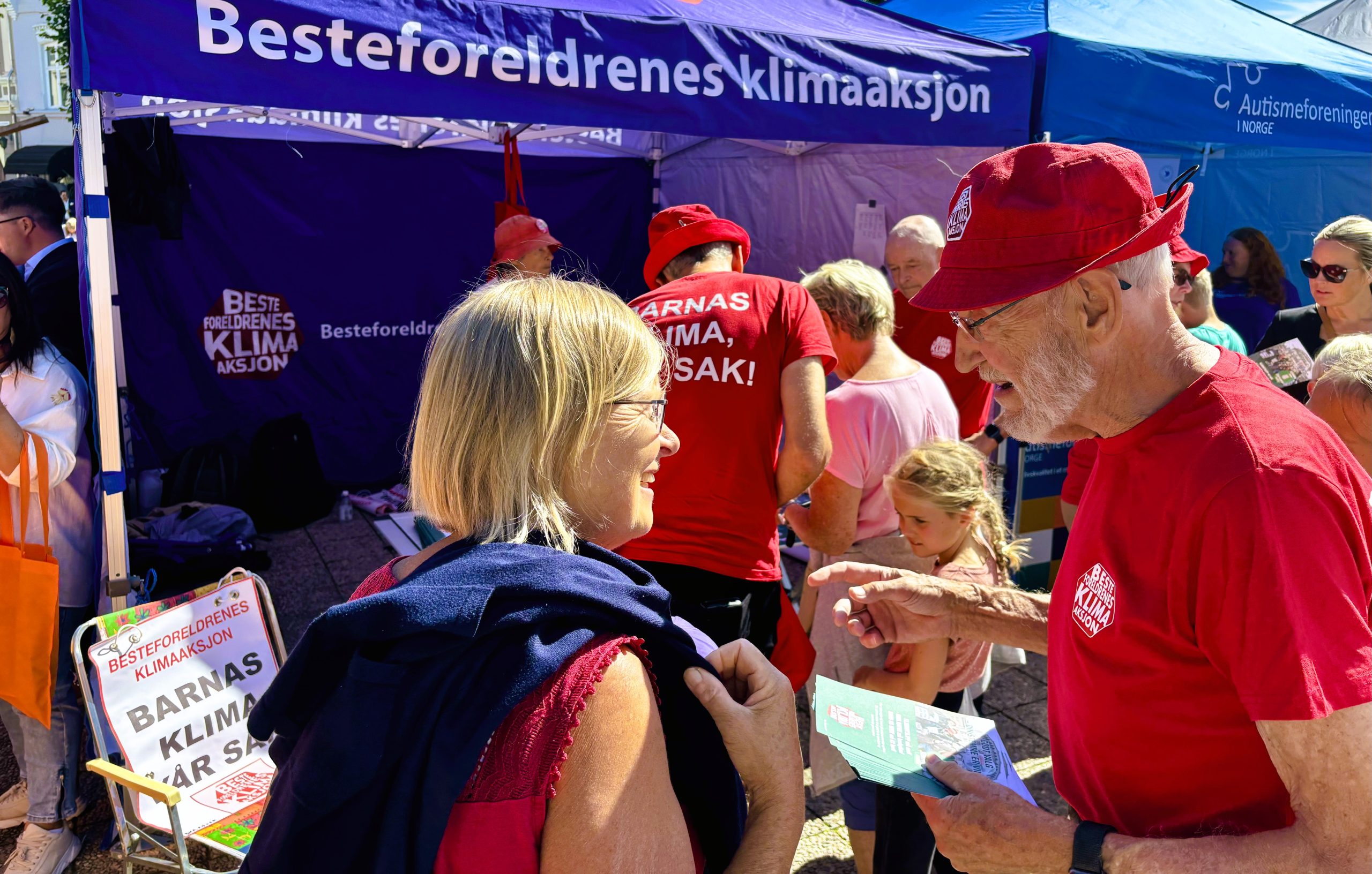 BKA-standen i Arendal er noe for seg sjøl. Under ei uke der byen fylles til randen av foreninger og grupper og messetelt, er det mange som legger turen innom torget og hilser på gamlisene som står der i sine røde hatter – med tro på at det nytter. I dag var det også mange som fant veien til vårt debattmøte om global rettferdighet.