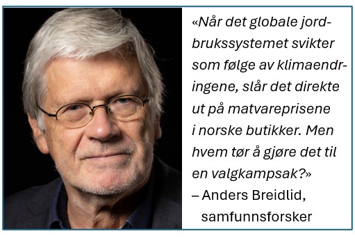 Dette har konsekvenser for norske husholdninger, som er blant de mest avhengige i verden av importert mat og varer. Når det globale jordbrukssystemet svikter, slår det direkte ut i prisene i norske butikker – og påvirker folks tillit til at myndighetene har kontroll. Prisene på mat og alkoholfrie drikkevarer steg hele 4,4 prosent fra juni til juli i år, en uvanlig høy vekst på en måned. Selvsagt er det grunn til å mistenke at dagligvarekjedene beriker seg på denne prisveksten, og næringsministeren reagerer da også kraftig på den kraftige prisøkningen. Selv om vi ennå ikke kjenner til alle bakenforliggende årsaker til denne prisveksten, er det neppe slik at regjeringen med et trylleslag eller med kraftige reaksjoner til dagligvarebransjen, kan få full kontroll over prisveksten på matvarer. Selv om finansminister Stoltenberg understreker at inflasjonen må holdes nede gjennom å føre en ryddig økonomisk politikk, har han i realiteten begrenset innflytelse over prisene på importvarer.