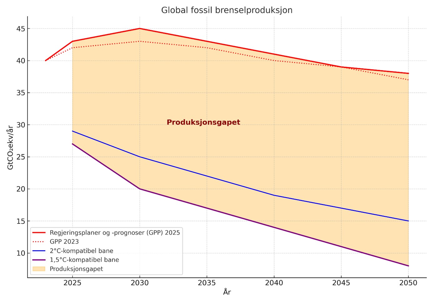 En rapport lansert mandag denne uka av Stockholm Environment Institute – Production Gap Report 2025, viser at verdens regjeringer planlegger å produsere 120 % mer fossilt drivstoff i 2030 enn det som er forenlig med å begrense global oppvarming til 1,5 °C. For 2 °C er gapet på 77 %. Prognosene for utvinning og produksjon av kull, olje og gass er alle økende sammenlignet med forrige vurdering i 2023. Mange scenarier viser også økende oljeproduksjon etter 2050. Følgen er at også begrensningen i den globale temperaturen til to grader, som er smertegrensen i Parisavtalen, nå er utenfor rekkevidde – uten svært dramatiske og raske tiltak.