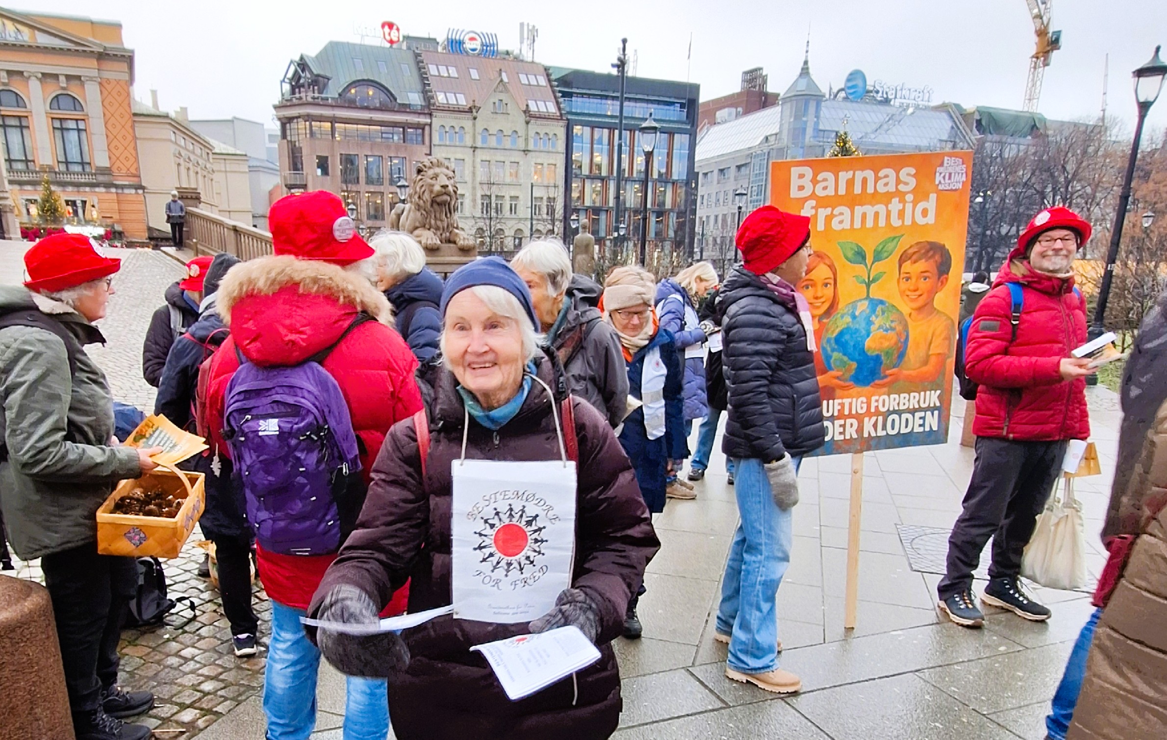 Oslo 10. desember: Ivan Chetwynd, nesteleder i BKA Oslo og omegn, forteller at lagets forbruksgruppe vandret oppover Karl Johans gate og delte ut løpesedler om å redusere klimaavtrykket når vi gir julegaver – sammen med kongler som kunne brukes til å lage julegaver. – Det var ikke så mange ute å handlet en mørk onsdag formiddag, men det ble noen samtaler – og en flokk barnehagebarn tok ivrig imot hver sin kongle. Vi kom ikke lenger enn til ærverdige Grand Hotel, der vi møtte andre besteforeldre med et annet viktig budskap til den store menneskemengden som var samlet der: «Bestemødre for fred» er som vanlig på plass når Nobels fredspris blir delt ut.