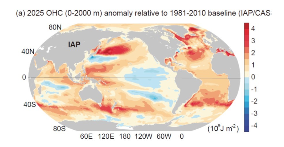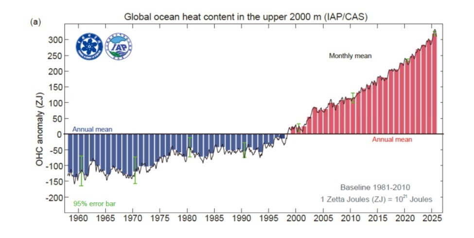 Figuren er fra en artikkel av Pan og medarbeidere (Pan et al, 2026 – Ocean Heat Content Sets Another Record in 2025). Artikkelen viser også tilsvarende figurer for to andre datasett. Trendene stemmer bra overens. Økende konsentrasjon av klimagasser i atmosfæren er hovedårsaken til det økte varmeinnholdet. Reduserte mengder aerosoler (partikler) har også spilt en rolle siden de fleste aerosoler har en avkjølende effekt.