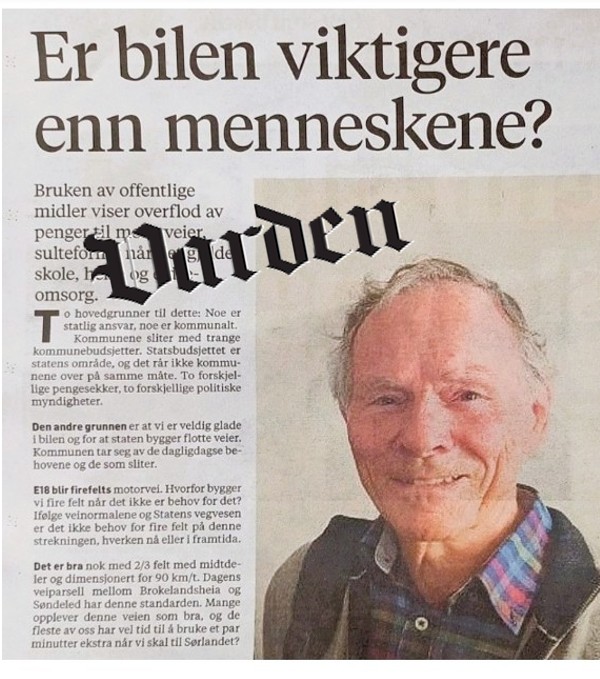 Bruken av offentlige midler viser overflod til motorveier, sulteforing av skole, helse og eldreomsorg. Skyldes det bare at dette går over to ulike budsjetter? Eller dreier det seg også om at vi er så glad i bilene våre og synes de må prioriteres? – Kan bilen være viktigere enn mennesker? spør Torstein Fjeld i Besteforeldrenes klimaaksjon.