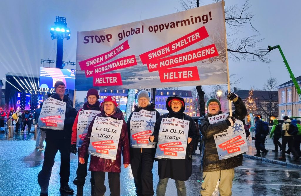 Fuktig ski-VM i Trondheim 2025: Besteforeldrene i demonstrasjon for et bedre klima. Nina nr. 3 fra venstre.