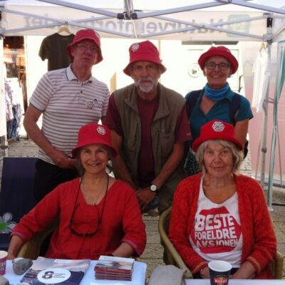 Arendalsuka er i gang, og Besteforeldrene markerer seg sterkt og tydelig også dette året. Den store dagen er torsdag, sier Ellen Schei Tveitdal fra lokallaget i Aust-Agder. Da er det teltmøte i samarbeid med flere andre organisasjoner – og så vår egen klimapub der alle miljøengasjerte er invitert til å delta i debatter, konsert og allsang. Birgitte Grimstad og Ola Dimmen er allerede i gang med øvingene, kan Ellen fortelle. Selv har hun vært på stand, sammen med folk fra hele landet. – Det gjelder å vise bredde og at vi står for det vi mener. Og så er det jo så sosialt og hyggelig når vi er en hel gjeng sammen slik vi har vært i dag!