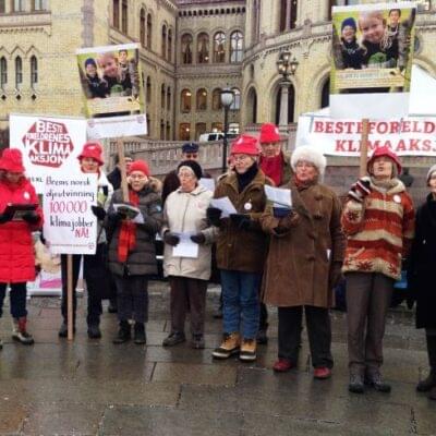 Mest mulig glede til minst mulig forurensing: Besteforeldre brenner for framtida og barna, og synger det gjerne ut! I går formiddag ljomet det foran Stortinget, til Beethovens kjente og kjære melodi fra «Ode til gleden»