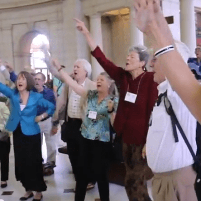 Vi eldre er den raskest voksende del av befolkningen og kan bety mye politisk, sier talskvinne Ellyn Dooley fra Elders Climate Action, amerikansk besteforeldreaksjon med medlemmer over hele USA. Og som i Norge synger de bokstavelig talt ut sitt budskap: På «Grandparents Climate Action Day» ljomet det mellom veggene på Union Station i Washingtom DC: «We need to build a better future … and we need to do it NOW, NOW, NOW!» Musikalsk leder for Besteforeldrenes rangleorkester i Trondheim, Ola Dimmen, er begeistret. Sang kan kanskje ikke forandre verden, sier han. Men uten sang blir det ikke noen skikkelig bevegelse!