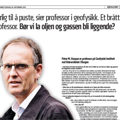 Fortsetter vi som nå, risikerer vi at luften blir for dårlig å puste i, sier professor i geofysikk. Et brått fall i oljeaktiviteten er det vi bør frykte mest, i følge NHH-professor. Slik innleder Bergens Tidende møtet mellom to ulike fageksperter. «Oljebransjen er så langsiktig at å styre tempoet på aktivitet som er i gang grenser til å være praktisk umulig. Ønsker man å la olje ligge i bakken, bør man la være å åpne opp nye områder.» (Øystein Thøgersen, økonom) «Oljeaktiviteten vil likevel være stor i mange år fremover. Stortinget bør investere betydelige midler i en overgangsfase, bort fra vår oljeavhengighet.» (Peter M. Haugan, fysiker)