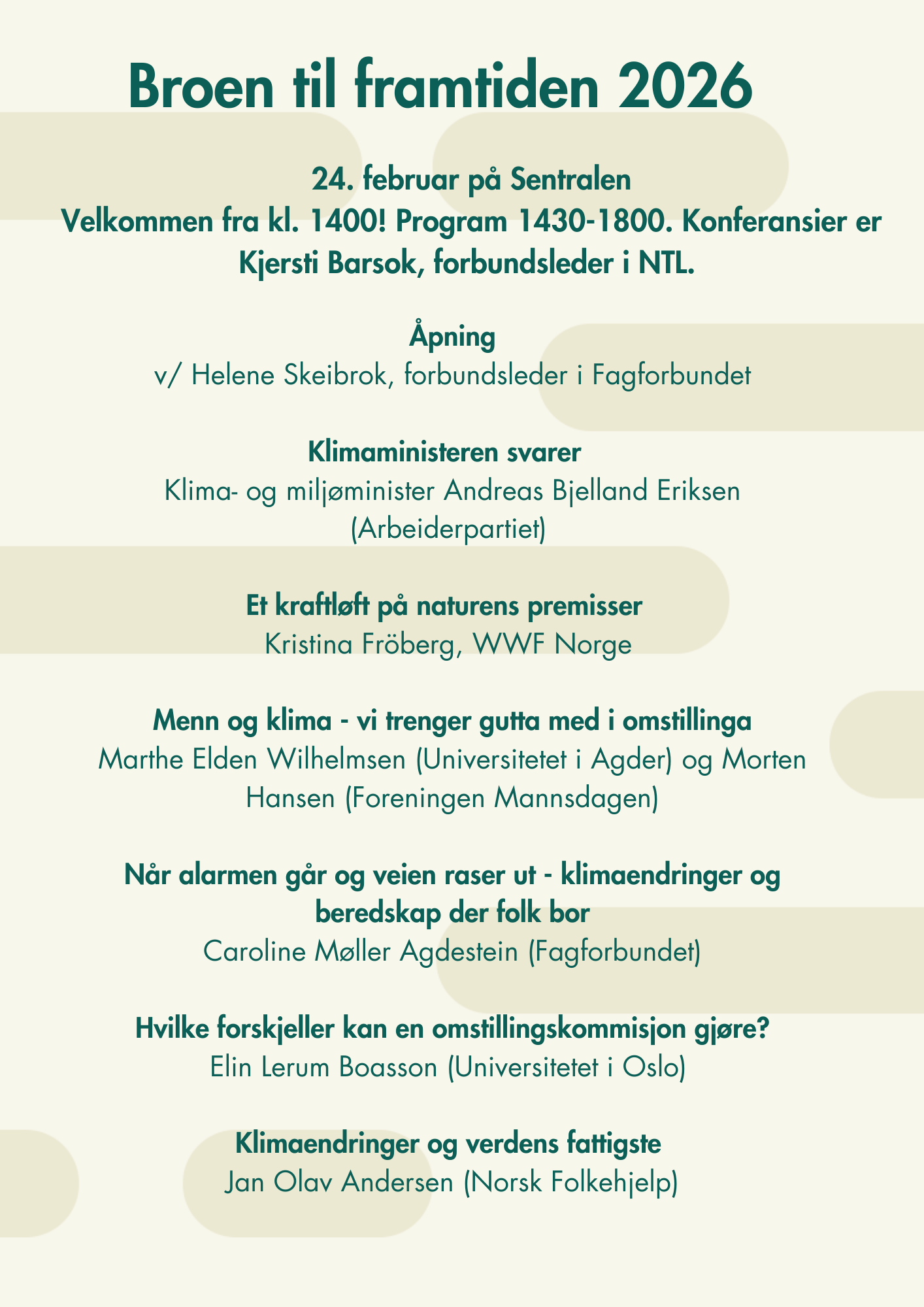 2025 var det varmeste året noensinne målt i Norge. Behovet for en rask og rettferdig omstilling blir stadig større, samtidig som den globale klimadugnaden går trått. Derfor trenger vi å møtes for å lære og diskutere hvordan vi skaper en rettferdig, grønn omstilling.