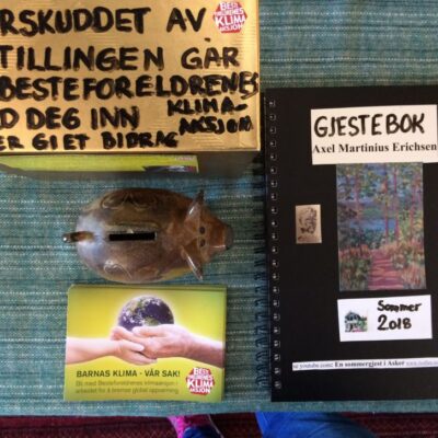 – Vet ikke om dette er noe å skrive om, men i hvert fall er bildet tatt ved inngangen i forbindelse med at jeg holder en kunstutstilling av min bestefars bilder og malerier i Selvikvillaen i Vollen i Asker, står det i en epost redaktøren fikk fra Margaret Heldor, som fortsetter: – Som du ser, går overskuddet til Besteforeldrenes klimaaksjon. Vet ikke om det blir så veldig stort, men i hvert fall blir pengene på sparegrisen sendt videre. Mange har forsynt seg med brosjyren vår.