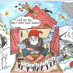 Ho ho! Her kommer årets julekort fra BKA-aktivist Idar Støwer i Trondheim. Han har det med å tegne en kommentar til aktuelle saker, og slik er det blitt også denne gangen, da våre tanker går til det palestinske folket. Glemmes skal heller ikke at året 2024 var det varmeste i historien, og det globale 1,5-gradersmålet ble sprengt.